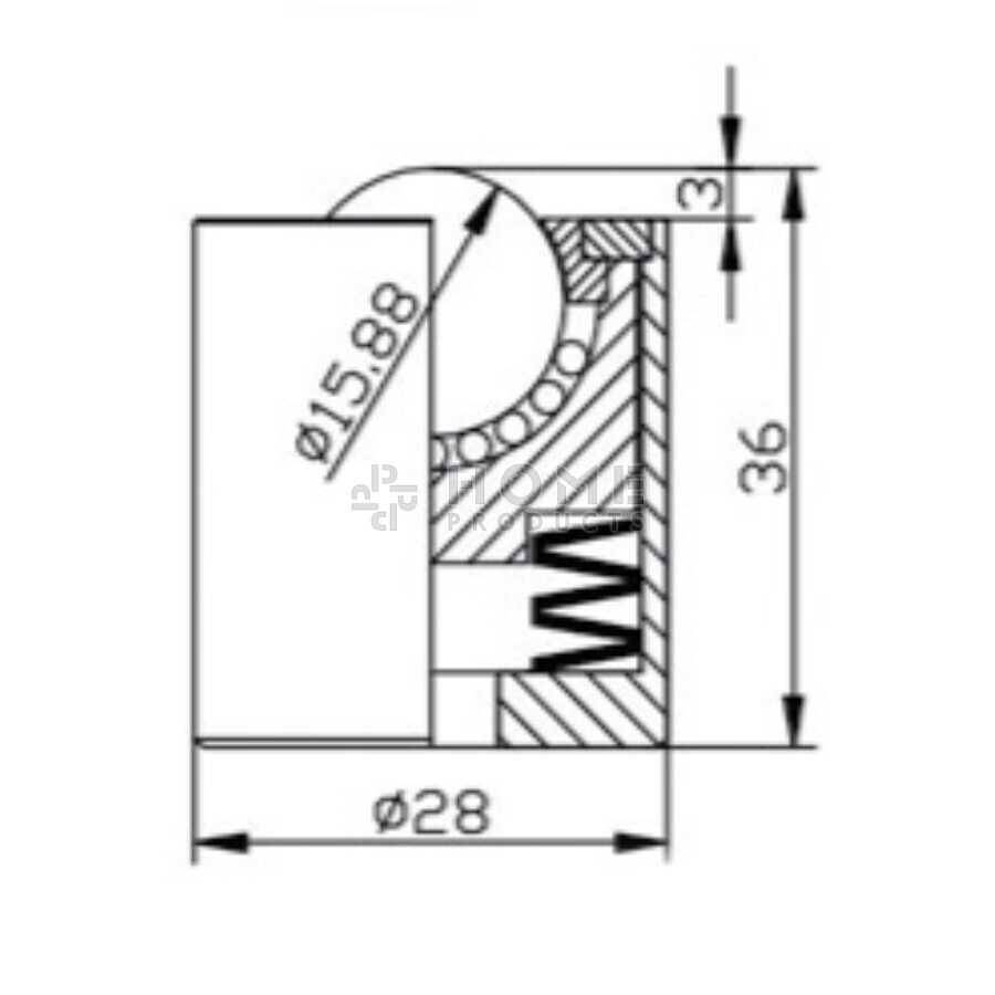 Kogelrol met een stalen 15.88 mm kogel en veer. De maximale belasting die deze kogelrol kan hebben is 50 kg. Stalen kogels zijn bedoeld voor transport snelheden tot 2 m/s (7,2 km/h).