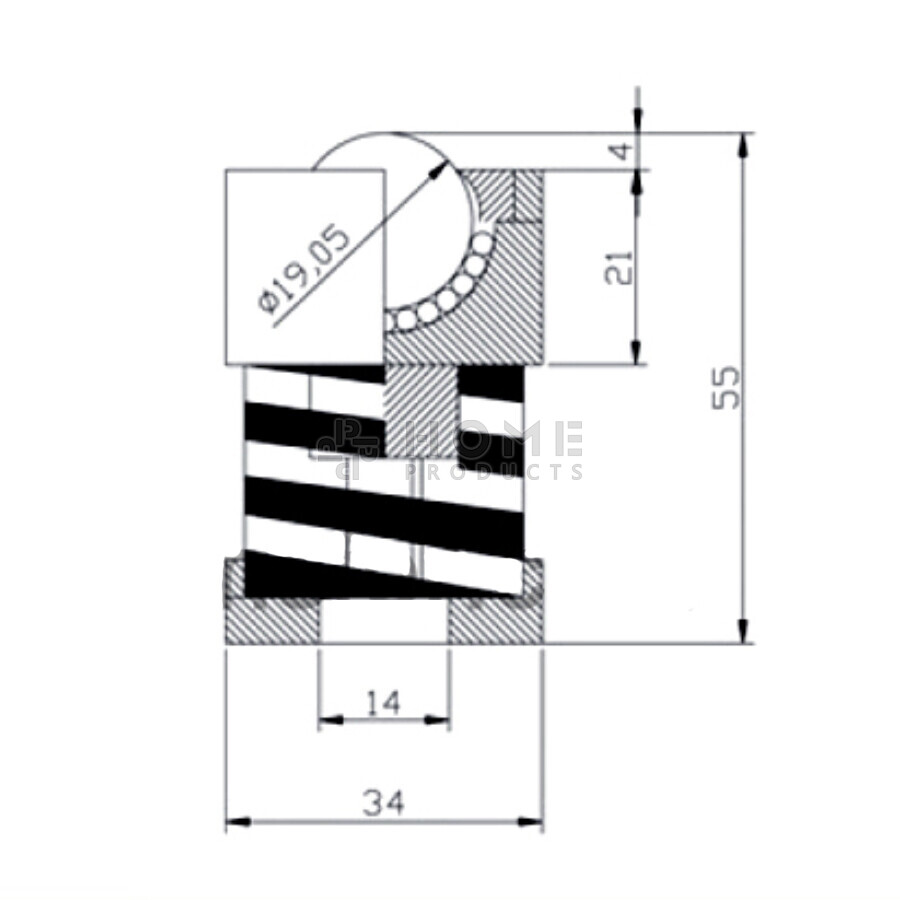 Kogelrol met een stalen 19.05 mm kogel en veer. De maximale belasting die deze kogelrol kan hebben is 50 kg. Stalen kogels zijn bedoeld voor transport snelheden tot 2 m/s (7,2 km/h).